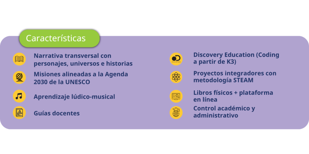 Combina lo mejor de la pedagogía contemporánea con una narrativa lúdica, transversal y musical, materiales impresos de alta calidad, plataforma digital y un sólido enfoque en el desarrollo de habilidades reales y misiones alineadas a los Objetivos de Desarrollo Sostenible de la UNESCO.